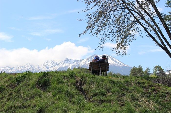 ベンチに座って御岳を眺めているカップルが居ると