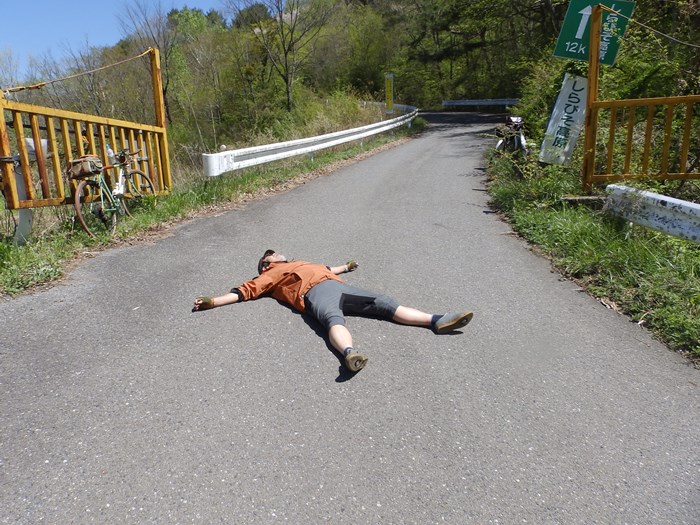 しんどすぎて地面に寝そべって休んでおられます。